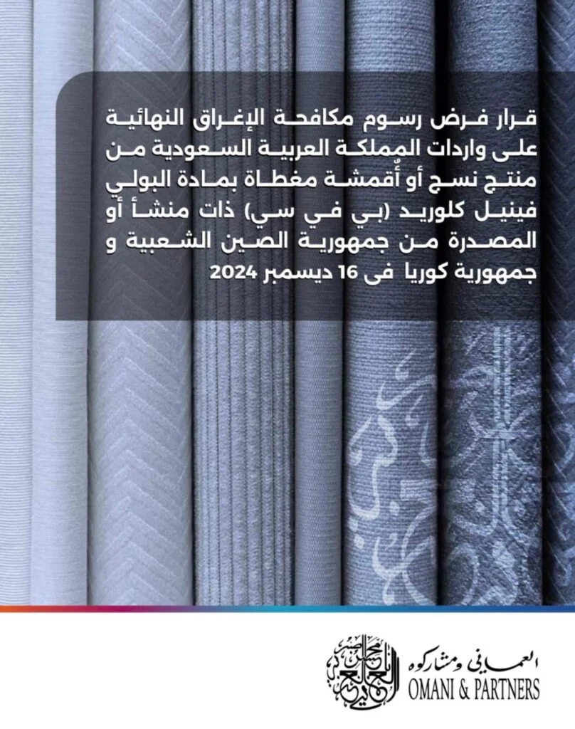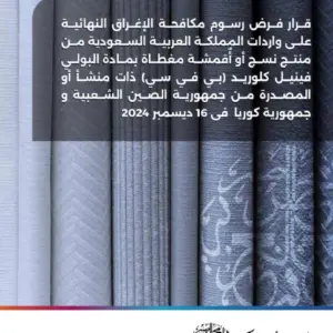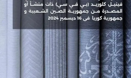 قرار فرض رسوم مكافحة الإغراق النهائية على واردات المملكة العربية السعودية من منتج نسج أو أقمشة مغطاة بمادة البولي غينيل كلوريد (بي في سي) ذات منشأ أو المصدرة من جمهورية الصين الشعبية و جمهورية كوريا فى 16 ديسمبر 2024